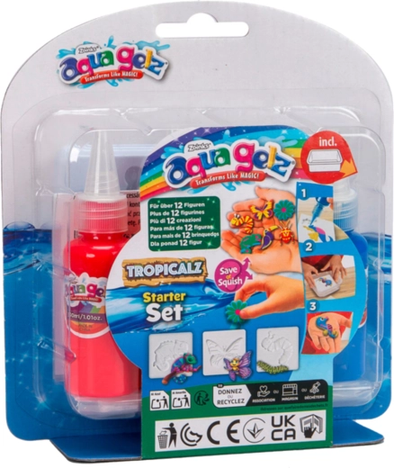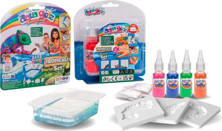 Otkrijte razigrano stvaranje s AQUA GELZ – zabavnim setom uz koji djeca lako izrađuju šarene gel figurice. Pomiješajte poseban prašak s vodom, odaberite kalupić, ispunite ga šarenim gelovima i kratko uronite. U trenu se ravna slika pretvara u mekanu 3D figuricu koja sama isklizne iz kalupa.