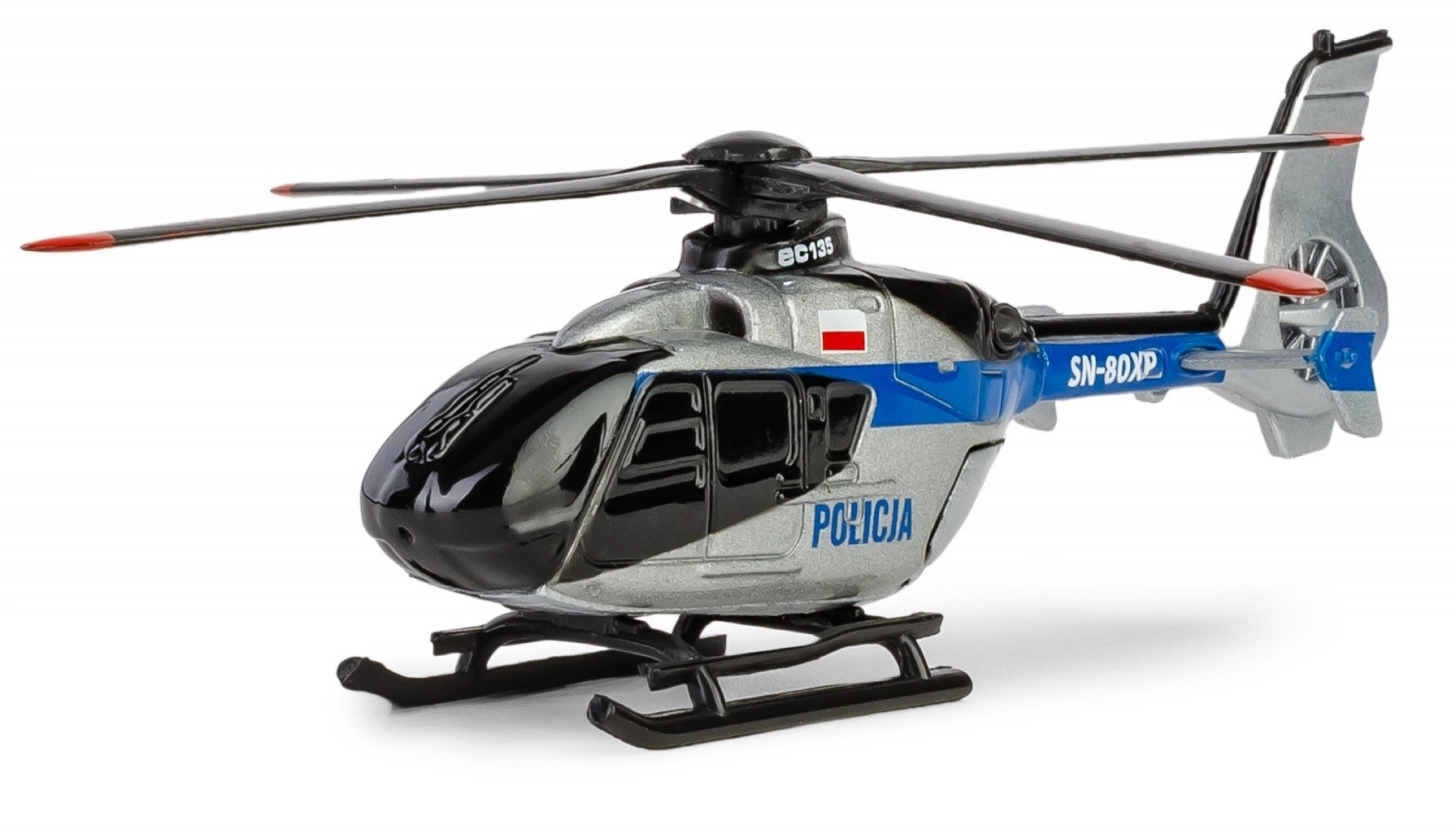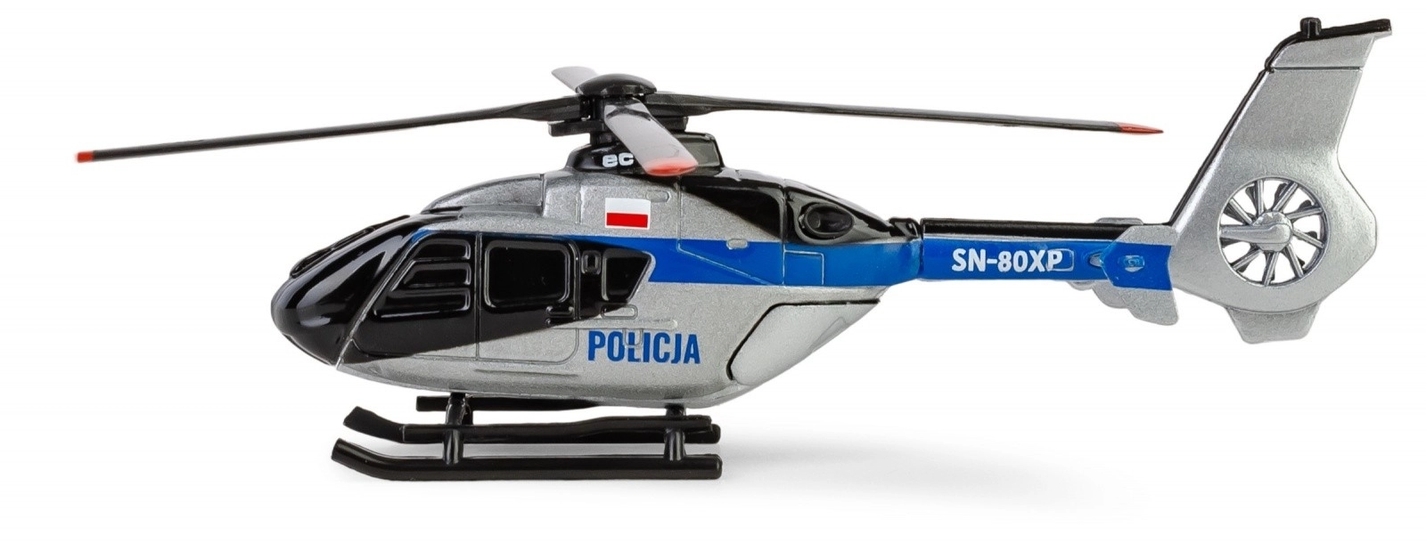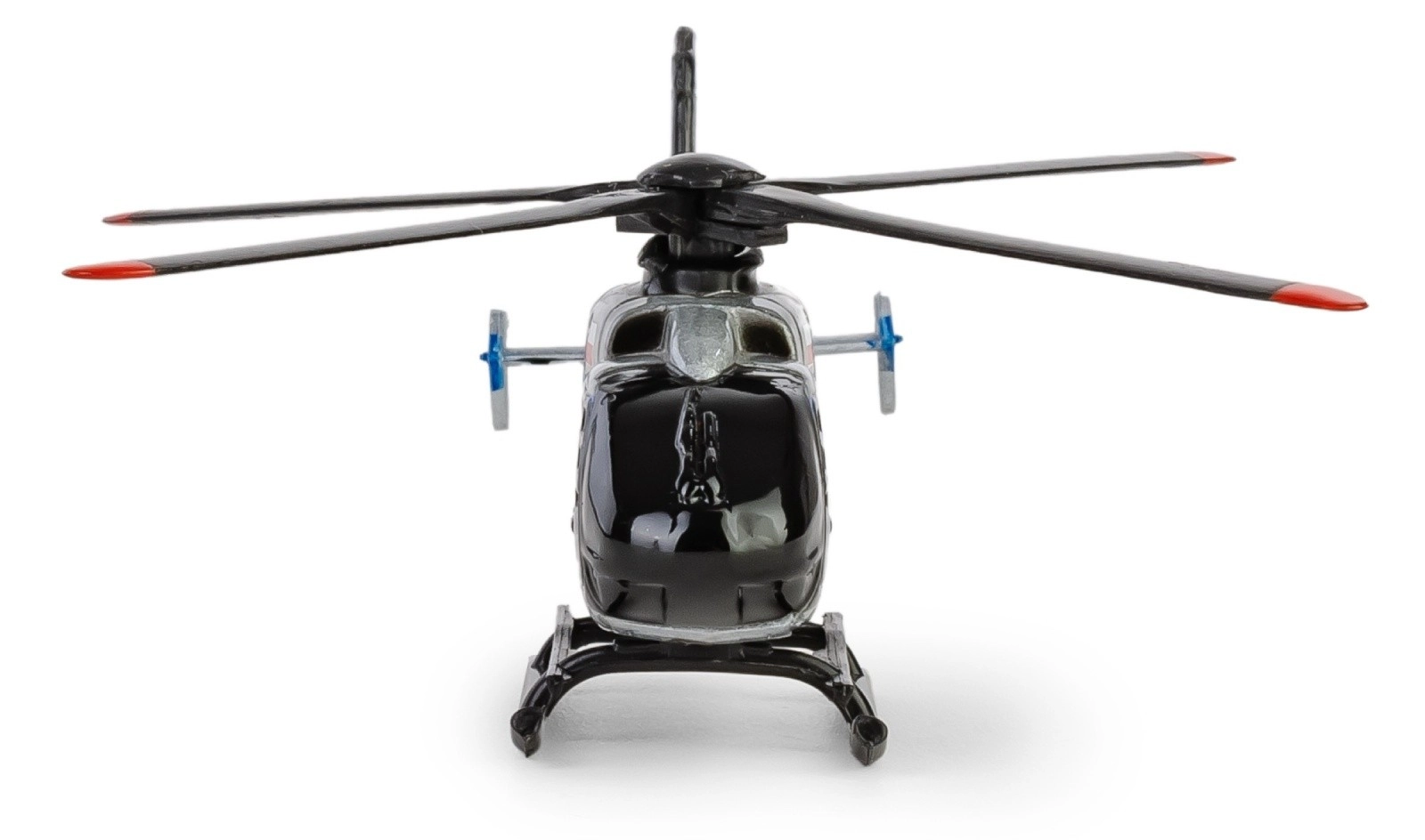 Licencirani model spasilačkog policijskog helikoptera vjerno prikazuje stvarni tip AIRBUS EC135. Zahvaljujući kombinaciji metalne karoserije i plastičnih detalja djeluje realistično, dobro drži oblik te je ugodan za izlaganje i igru. Kompaktno mjerilo 1:100 štedi prostor, a istovremeno naglašava detalje.