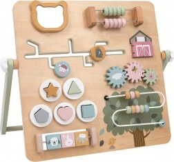 Ova Montessori drvena motorička ploča s motivima farme nudi djeci raznoliku paletu interaktivnih elemenata: okretne zupčanike, klizne elemente, perlasti i žičani labirint, mali abakus te umetaljke oblika. Sve je pregledno organizirano i izrađeno od kvalitetnih materijala za sigurnu i dugotrajnu igru.