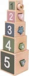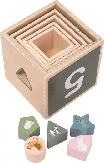 Sklopivi toranj od 5 drvenih kocaka različitih veličina djeci nudi bezbroj mogućnosti igre – od slaganja u visinu do raspoređivanja jedne do druge. Otvara vrata svijetu mašte s farmarskim motivima i istovremeno potiče razvoj vještina. Na jednoj strani svaka kocka ima otvor za ubacivanje oblika, što je čini idealnom igračkom za učenje i istraživanje.