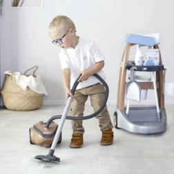 - Kolica na kotačima, dječji usisavač sa zvukom, lopatica i metlica, mop, četka/glava četke, kanta, imitacije sredstava za čišćenje