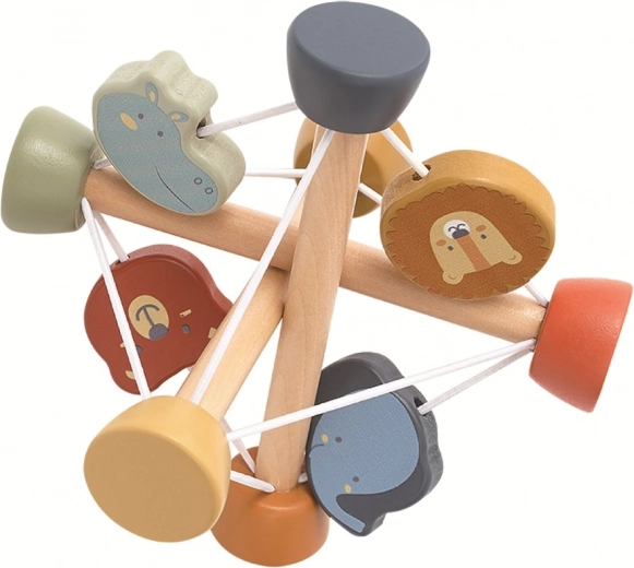 Aktivna kugla Safari kombinira kvalitetno drvo s elastičnim gumicama i prijateljskim dizajnom životinja (lav, slon, nilski konj i medvjed). Djeca na razigran način uvježbavaju hvat, koordinaciju i strpljenje. Pastelne boje i glatka obrada privlače pažnju i potiču koncentraciju.