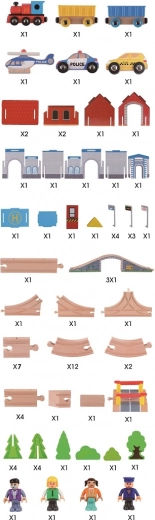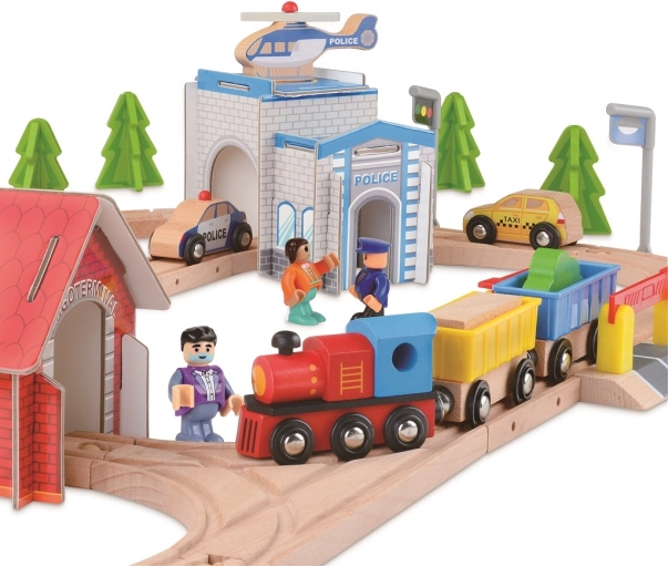 Ovaj detaljno osmišljen željeznički set nudi potpuni svijet na tračnicama: lokomotivu s vagonima, automobile, figurice, policijsku postaju, heliport, stabla i prometnu signalizaciju. Djeca mogu utovariti teret, prijeći preko povišenog mosta, stati kod postaje i sigurno proći preko prijelaza s rampama. Svaka vožnja pretvara se u novu priču i razvija logiku, koordinaciju oko–ruka i komunikaciju u zajedničkoj igri.