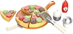 Drvena/plastična pizza u segmentima s odvojivim dodacima, rezačem i lopaticom za posluživanje potiče kreativnost i finu motoriku.