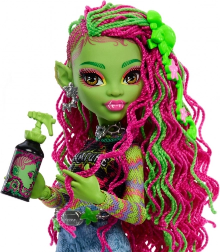 Otkrijte biljnu zvijezdu svijeta MONSTER HIGH. Venus McFlytrap blista u šarenom outfitu s printom, traper šorcevima i platformama s motivom lijana. Zahvaljujući zglobnim udovima lutka se lako pozuje i stvara fantazijske scene koje djeca vole.