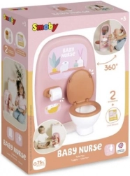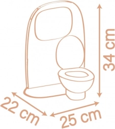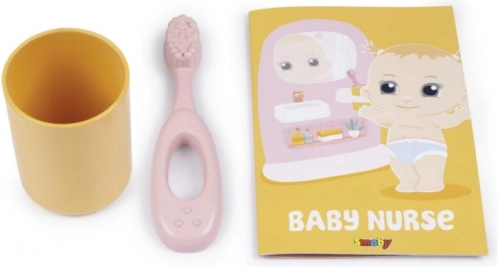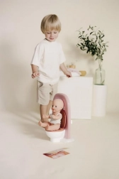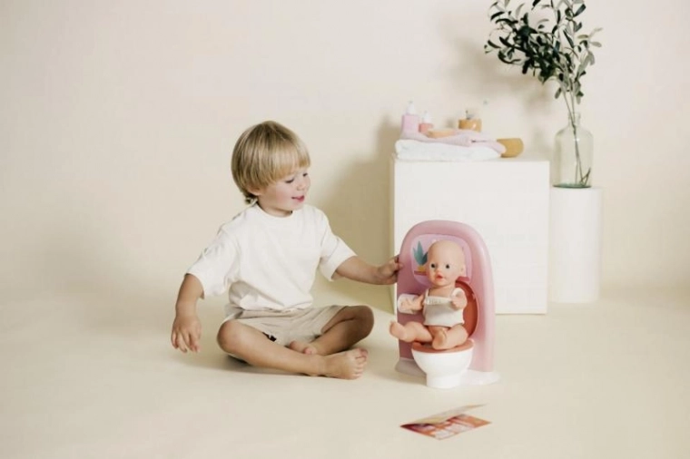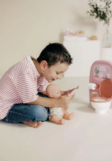 Stilizan kupaonski set za lutke iz linije Baby Nurse donosi sve potrebno za svakodnevnu njegu. U kompletu su WC školjka, umivaonik sa zrcalom, držač s rolicom toaletnog papira te dodaci poput četkice za zube i čašice. Pogodno za lutke do 42 cm i izrađeno od najmanje 75 % recikliranog materijala.