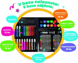 Praktičan kreativni set za male umjetnike u izdržljivom plastičnom koferčiću nudi sve potrebno za slikanje i crtanje. Idealan za dom, vrtić i putovanja. Sadrži raznovrstan izbor pomagala koja potiču dječju maštu i finu motoriku, uključujući bojice, flomastere i vodene boje.