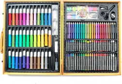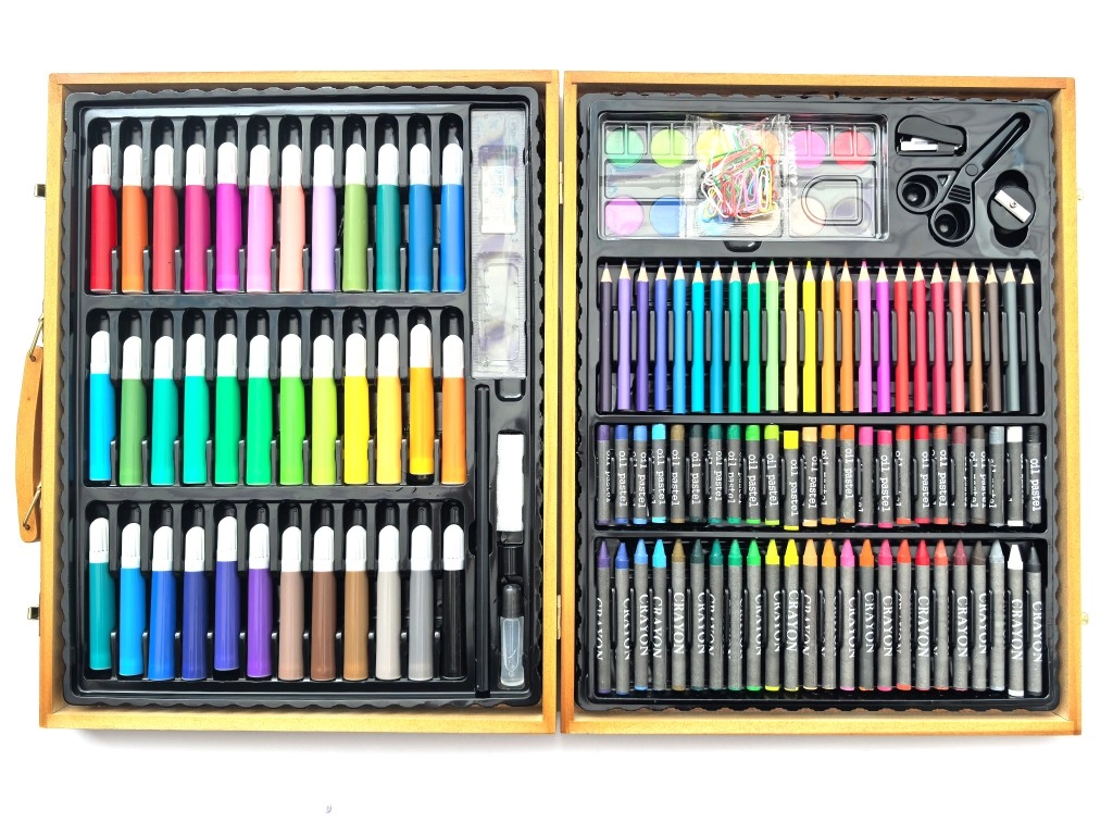 Kompletan set za male i velike stvaratelje u elegantnom drvenom kovčegu. Sadrži 150 kreativnih pomagala za crtanje, slikanje, rezanje i lijepljenje – idealno za dom, školu i putovanja.