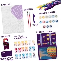 Sve potrebno nalazi se u pakiranju: kvalitetno platno s unaprijed otisnutim predloškom, samostvrdnjavajuća modelarska masa za reljefne dijelove balona, boje i kist, praktičan modelarski alat te slikovni vodič korak po korak. Zahvaljujući jasno označenim brojevima, postupak je intuitivan i za umjereno napredne stvaratelje.