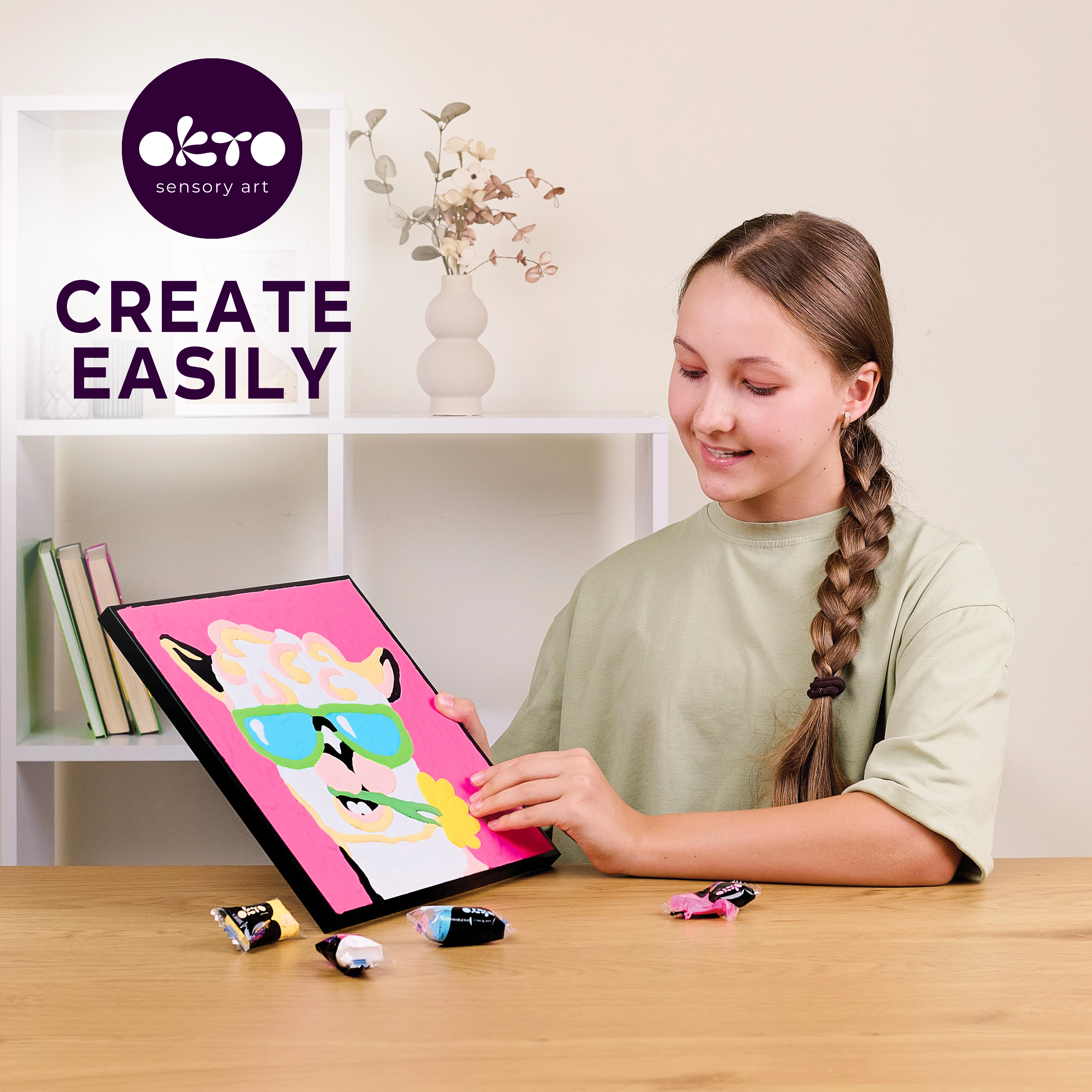 • Kompletan set – uključuje platno, slikovni priručnik, modelirajući alat i 14 komada obojenih oblikovnih smjesa.
