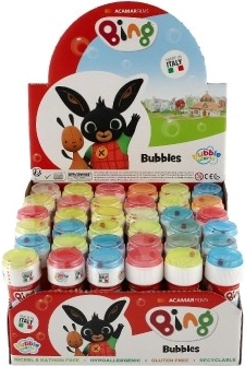 Bublifuk BING 60 ml idealna je sitnica za svakodnevnu igru, rođendanske proslave i dječje zabave. Zahvaljujući omiljenim likovima iz serije BING razveselit će svakog malog obožavatelja. Jednostavno puhanje mjehurića potiče koordinaciju, kreativnost i boravak na svježem zraku.