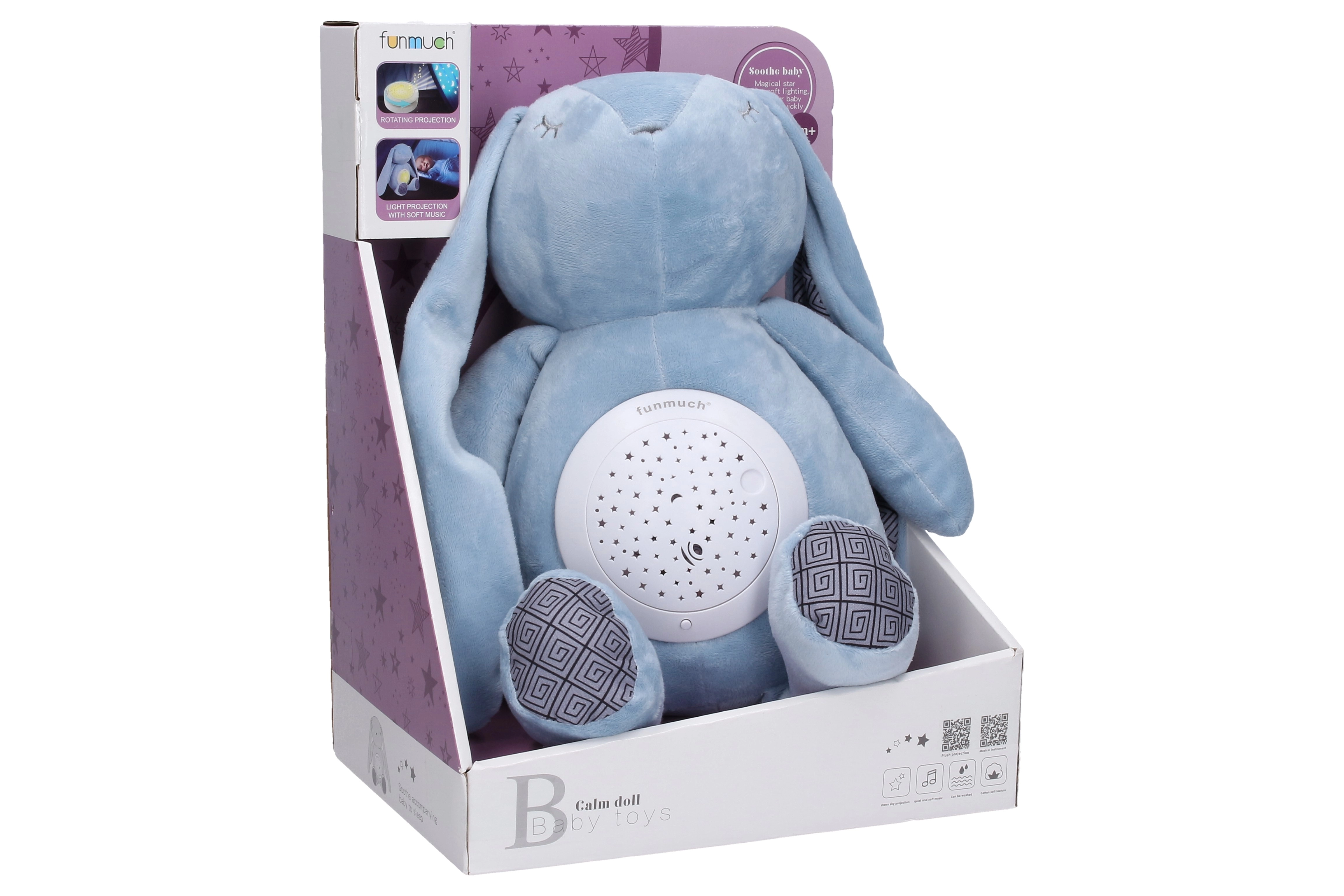 Preslatki zeko za uspavljivanje s projekcijom pomaže djeci mirno zaspati. Na trbuščiću ima svjetleći i rotirajući projektor koji projicira nježne svjetlosne uzorke i reproducira uspavanke. Projektor se lako vadi, upravlja se jednim gumbom i radi na 3× AAA baterije (nisu uključene).