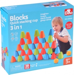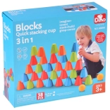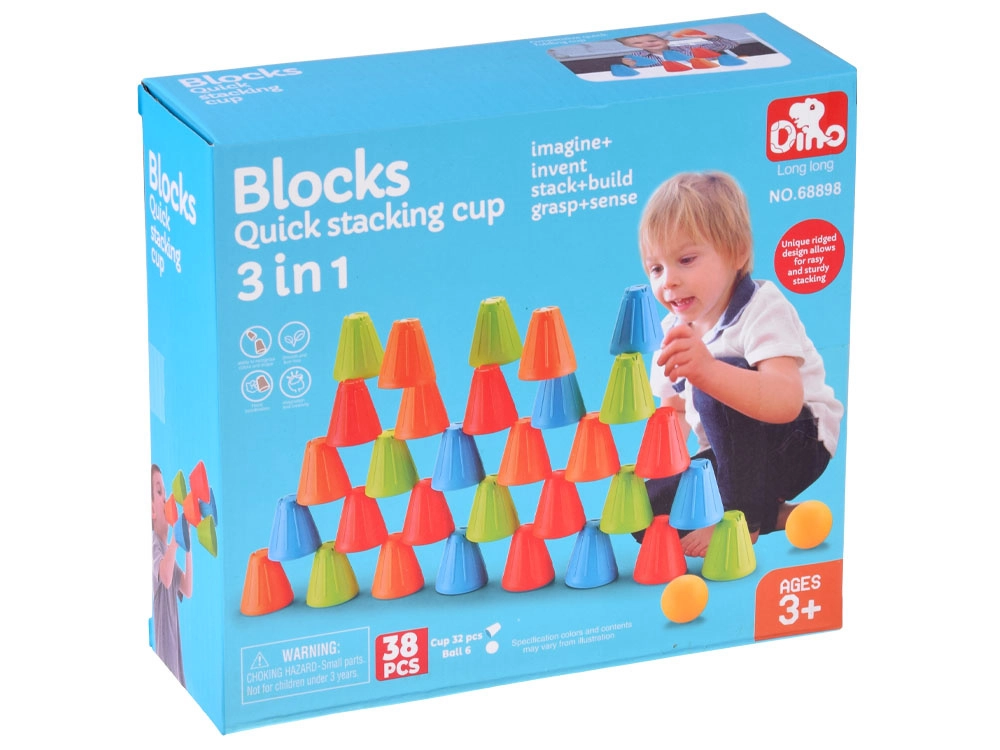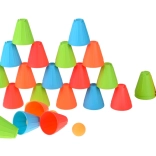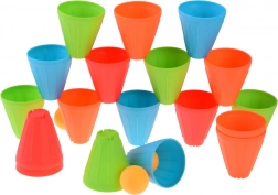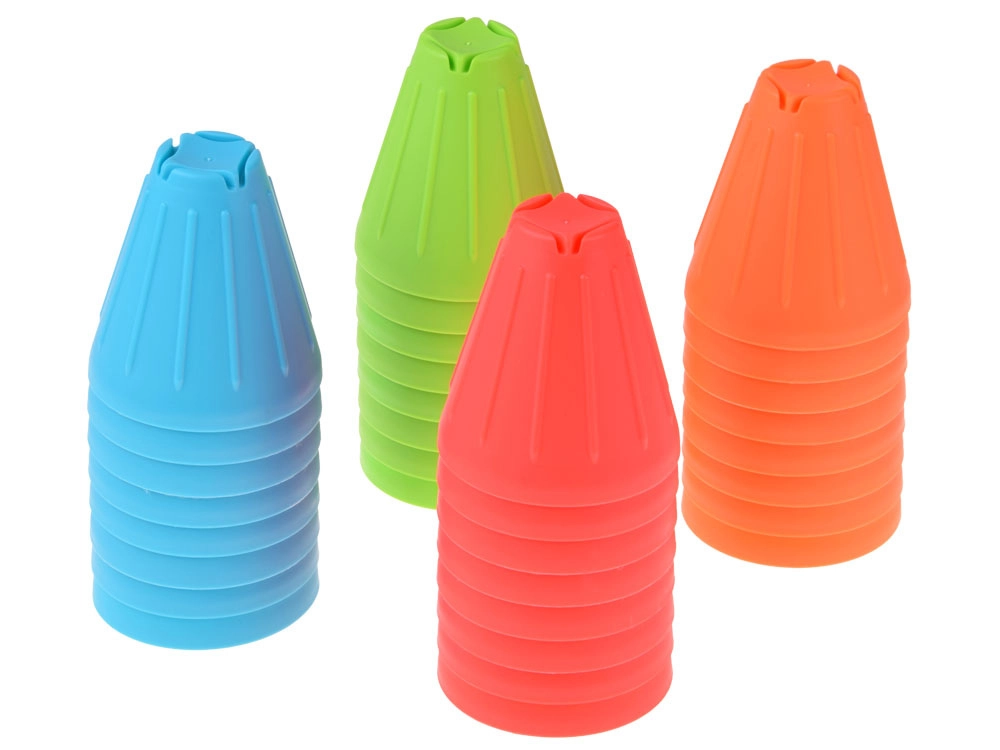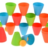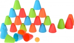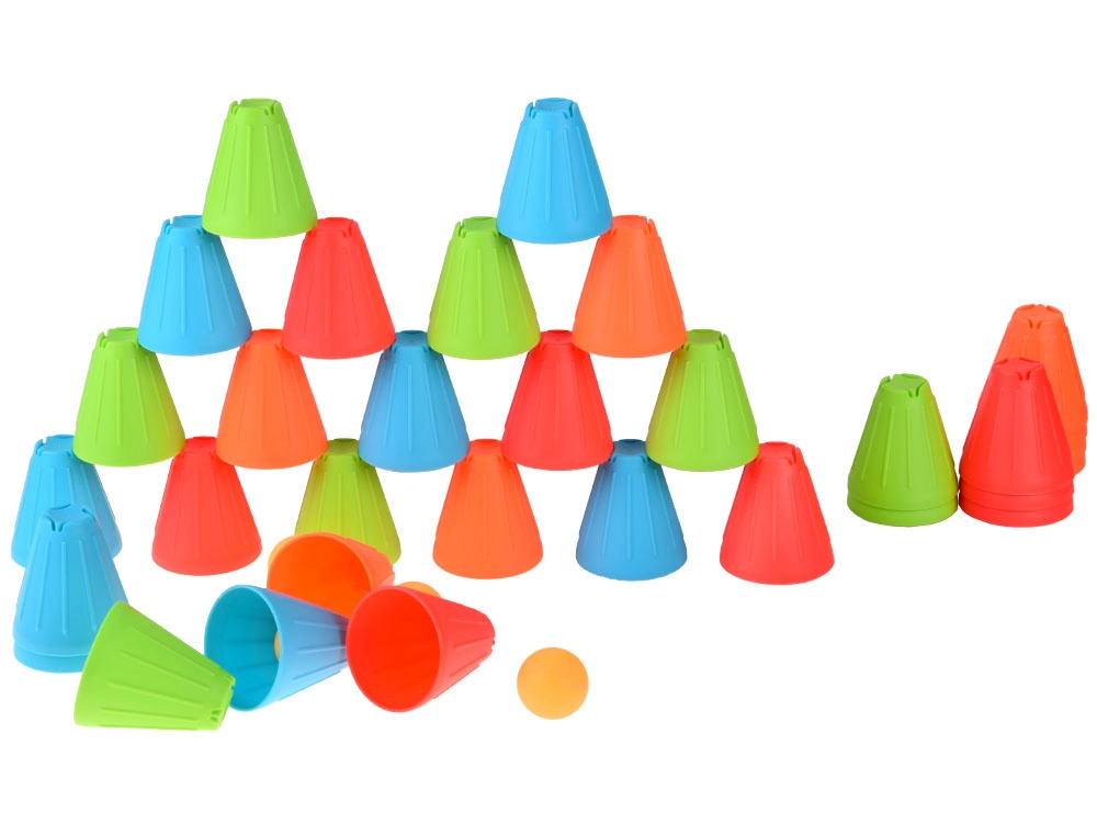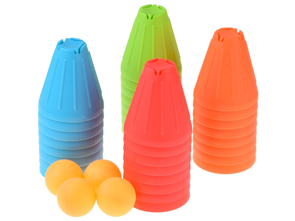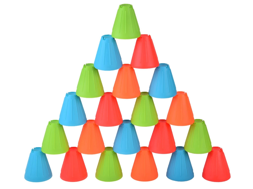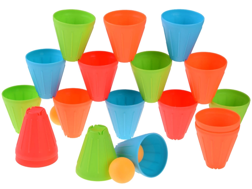 Ovaj univerzalni set donosi djeci sate aktivne zabave. Konusne čašice u intenzivnim bojama (zelena, plava, narančasta, crvena) lagane su, izdržljive i svojim oblikom se odlično slažu i slažu u stupce. Vanjska rebrasta površina poboljšava hvat, dok oblikovana unutarnja udubljenja olakšavaju stabilno povezivanje elemenata.