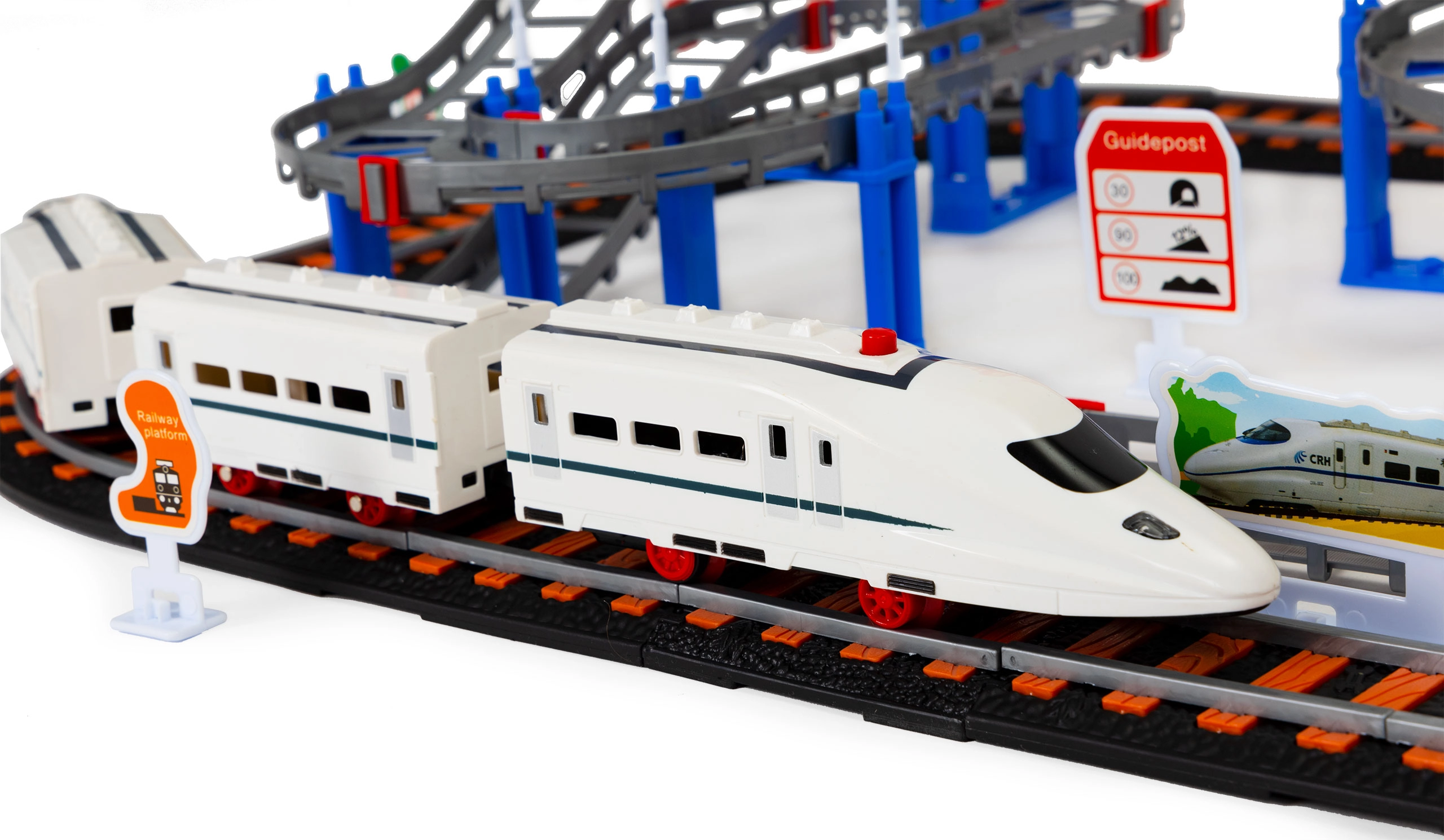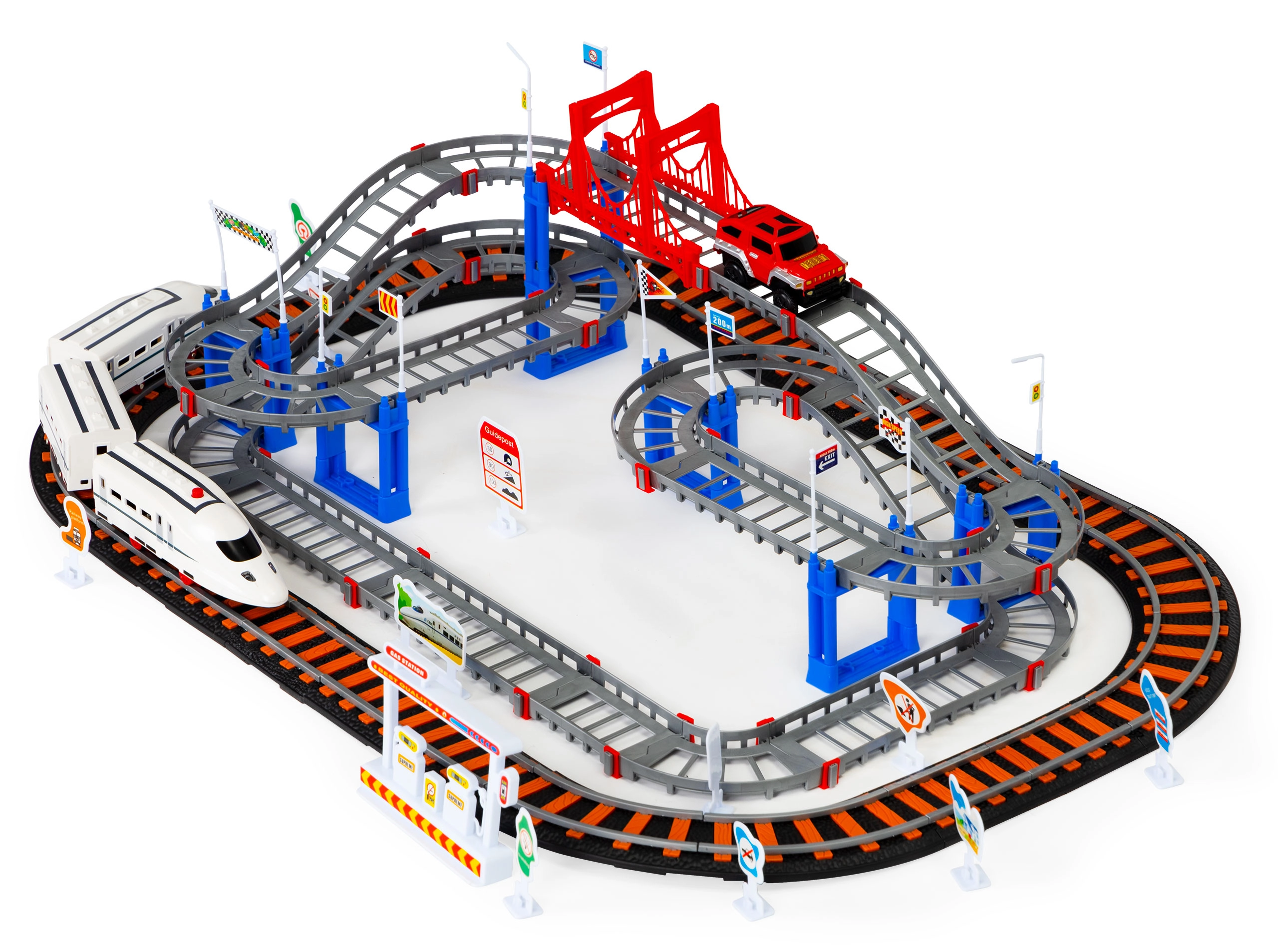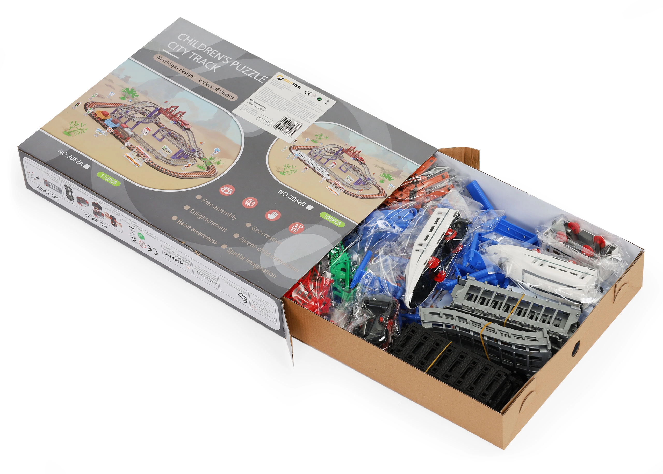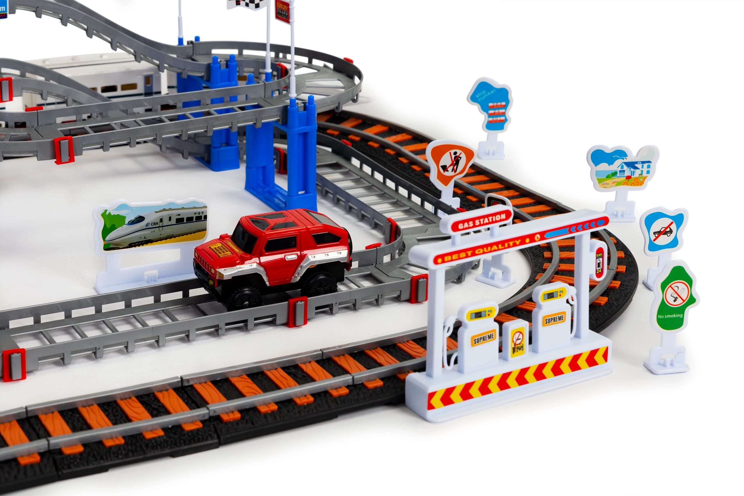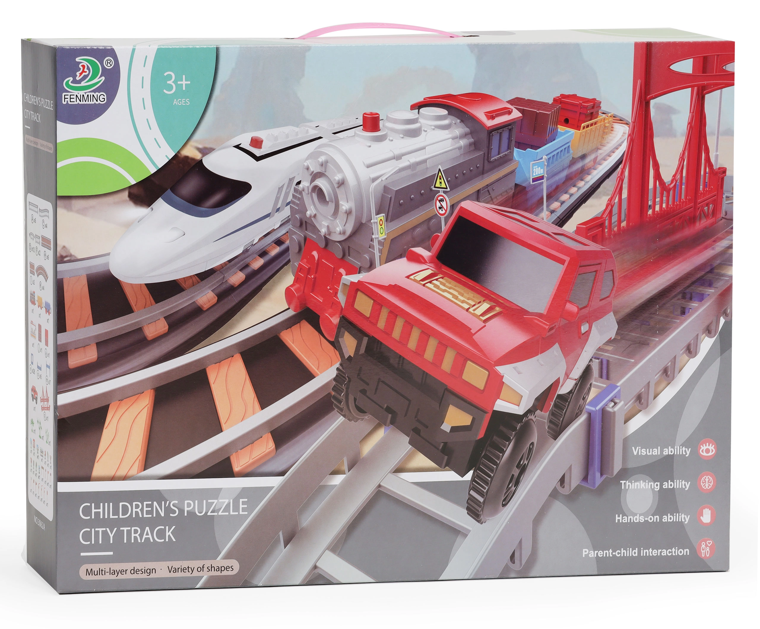 Ovaj sveobuhvatni set s 108 dijelova donosi dvotračni svijet za male ljubitelje vlakova i automobila. Dvije odvojene trase – jedna za brzi vlakić s tri vagona i druga za terensko vozilo – omogućuju istodobnu vožnju bez sudara. Dijelovi se lako slažu i čvrsto drže, pa djeca mogu graditi spirale, mostove i rampe i svaki put pripremiti novi izazov.
