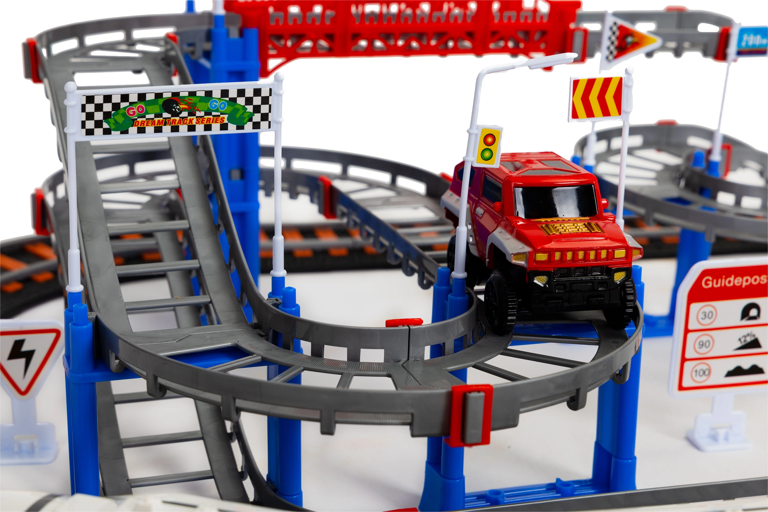 Brzi crveni SUV (1× AA) i moderni vlak s 3 vagona (2× AA) kreću po stazi odmah nakon uključivanja. Ujednačena vožnja i jednostavno upravljanje razveselit će male vozače i strojovođe.