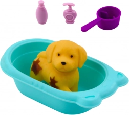 Presladak set za male njegovateljice: lutkica, psić i dodaci za kupanje. Najveća atrakcija je interaktivni psić kojem pod utjecajem vode nestaju smeđe mrlje. U kompletu je kadica s “tušem” i kozmetična oprema za realističnu igru njege te razvoj fine motorike i odgovornosti.