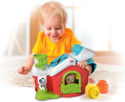 Djeca će uživati i u mehaničkim elementima: dimnjak ima funkciju „pritisni i iskoči”, pri čemu se kocka spušta van kroz bočni otvor, a vjetrokaz se zavrti već na lagani dodir. Osjetilne teksture na površini potiču razvoj osjeta dodira, dok razvrstavanje i manipulacija kockama razvijaju koordinaciju oko–ruka i finu motoriku. Tematsko farmsko okruženje s figuricama potiče kreativnu igru i stvaranje vlastitih priča.