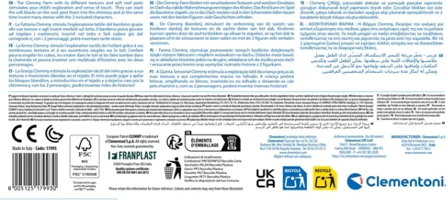 Ova interaktivna farma iz linije Clemmy nudi sigurnu i poticajnu igru za malu djecu. Unutra se nalazi mnogo mekih, lako uhvatljivih kocaka koje se mogu ubacivati kroz prozore i preko krova. Jedan dio krova ima mekani umetak za ubacivanje, drugi se otvara za lako vađenje kocaka.