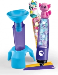 Dio seta su raznobojne tinte, prazna kućišta highlightera, sitni ukrasi i pomagala za sastavljanje. Djeca odaberu boju, napune flomaster, ukrase ga figuricama čarobnih životinja i dobiju gotov, originalan školski dodatak.