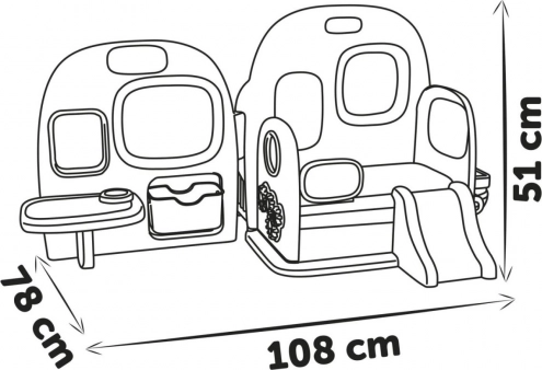 Sastavni dio je mala kupaonica s WC-om, umivaonikom i držačem toaletnog papira, zaseban katni krevet s toboganom za popodnevni odmor, blagovaonska i kreativna zona s malom pločom na koju se piše i briše te spremna škrinja za dodatke. Nakon igre cijeli se centar može jednostavno sklopiti i zahvaljujući ručki udobno prenijeti ili pohraniti.