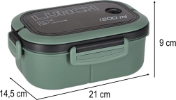 Praktična kutija za ručak 1200 ml s tri pretinca i nepropusnim poklopcem s 4 kopče održava užinu svježom i odvojenom. U setu je izvadiva razina, vilica i žlica. Prikladno za perilicu posuđa i mikrovalnu (bez poklopca), izrađeno od plastike bez BPA.