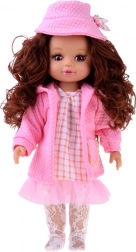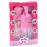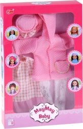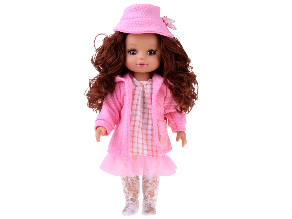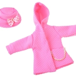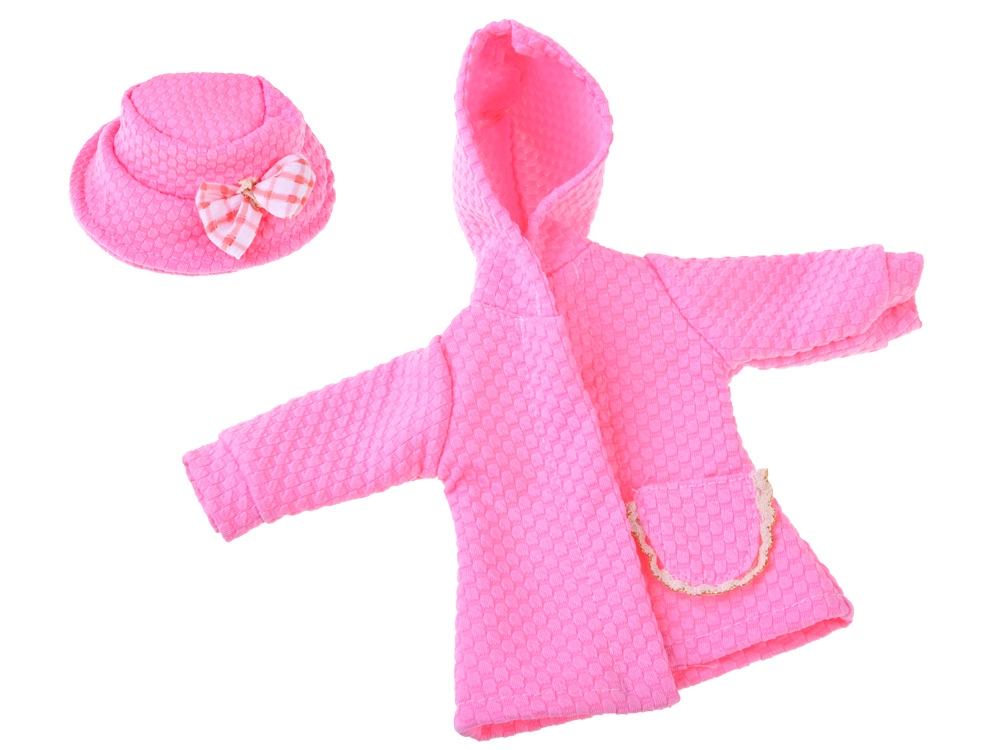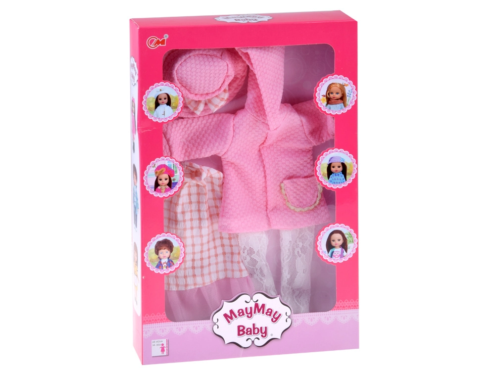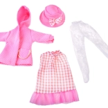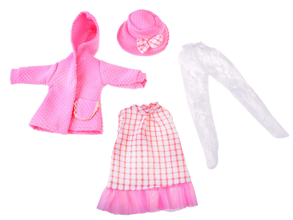 Elegantni ružičasti set odjeće osmišljen je za lutke visine 36–40 cm i savršeno spaja stil, udobnost i jednostavnu uporabu. Haljinu s nježnim ružičasto-bijelim karom nadopunjuje til volan, čipkaste tajice daju svečanu notu, a teksturirani kaputić s kapuljačom i džepićem grije tijekom “hladnih dana” u svijetu igre. Šeširić s mašnom sve lijepo povezuje.
