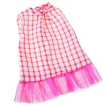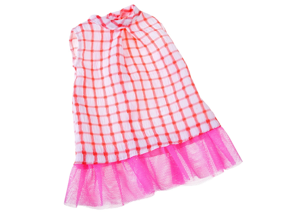 Haljina u bijelo-ružičastom kariranom uzorku s til volanom, čipkaste tajice i usklađeni dodaci pretvaraju lutku u malu damu. Outfit je idealan za “svečanosti”, posjete i svakodnevnu igru.