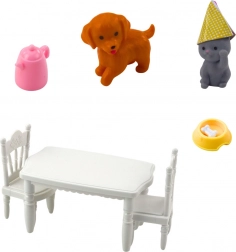 Lutka, 2 životinjice (pas i mačka), stol, 2 stolice, stolni pribor, rođendanske kapice, zdjelice za životinje, originalno pakiranje