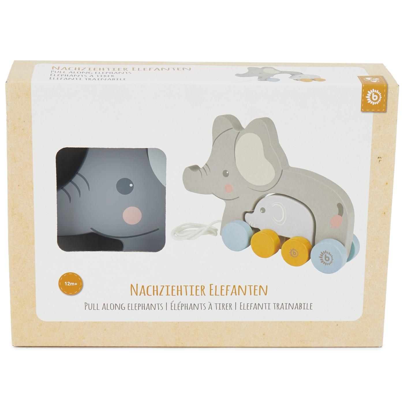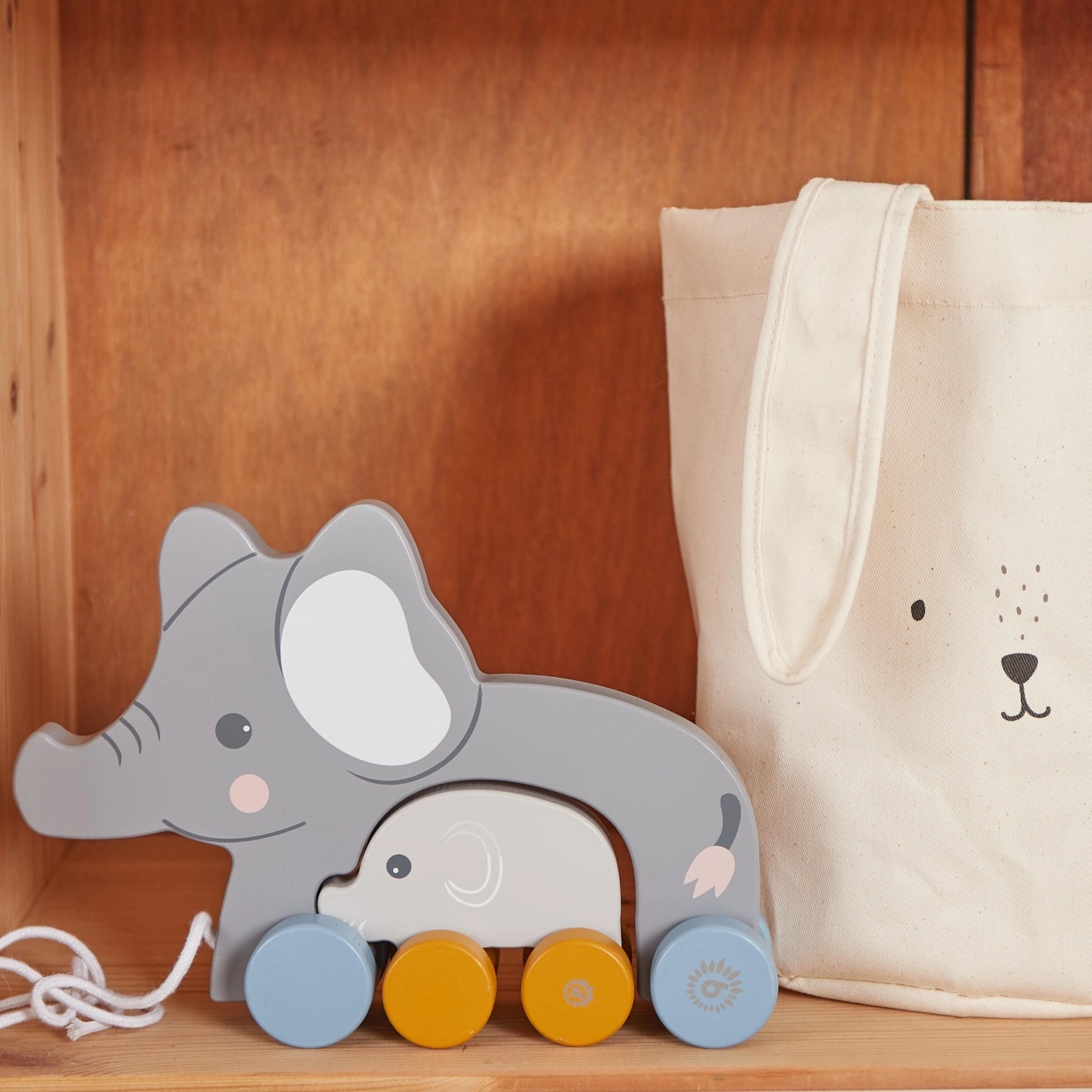 Slatka drvena igračka na povlačenje sa slonovskom obitelji od kvalitetnog drva potiče prve korake i finu motoriku. Veći slon s izvadljivim mladuncem, mekana pamučna uzica i glatka, sigurna izrada čine ovu igračku idealnim pratiteljem za male istraživače od 12 mjeseci.