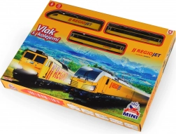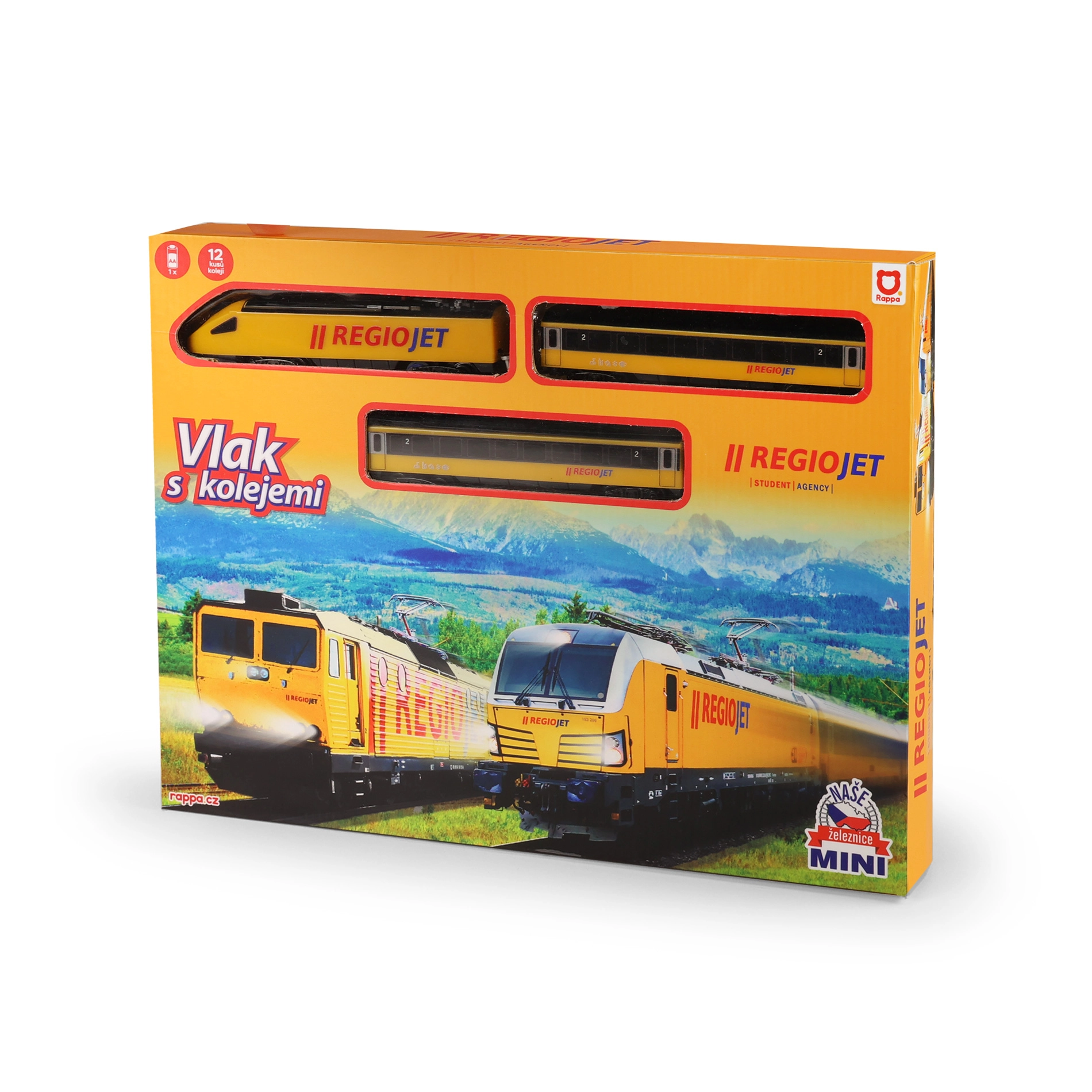 Otkrijte zabavu vlakova s kompaktnim setom RegioJet MINI. Žuta lokomotiva s dvama vagonima vozi po modularnom kolosijeku koji lako sastavite od 8 zakrivljenih i 4 ravna dijela. Zahvaljujući praktičnom prekidaču na krovu lokomotive upravljanje je potpuno jednostavno, pa se djeca mogu brzo baciti u igru.