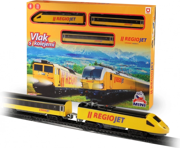 Vlak RegioJet MINI na baterije – žuta lokomotiva s vagonima i kolosijekom