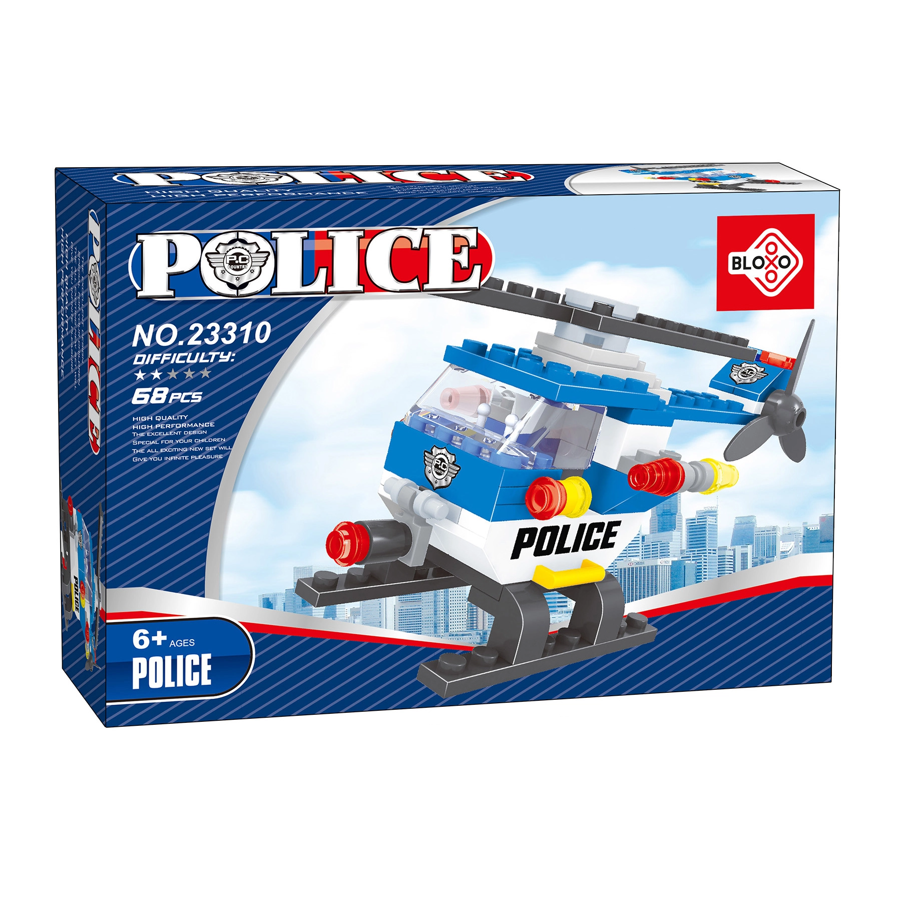 Set za slaganje BLOXO Policijska helikopter nudi djeci zabavu i učenje u jednom. Od 68 pomno dizajniranih dijelova sagradit će stilski policijski helikopter te krenuti u napete zračne intervencije, potrage i potjere.