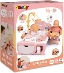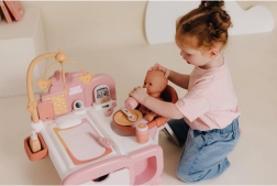 Elektronički kutak Baby Nurse SMOBY savršen je izbor za male njegovatelje i njegovateljice. Tri igraće zone – kuhinica s hranilicom, stanica za njegu i krevetić s vrtuljkom – potiču kreativnu igru te razvoj fine motorike, empatije i mašte. Integrirana atrapa kamere i elektronička bebi veza sa zvukom dodaju autentičan doživljaj brige o bebi.