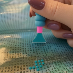 Žljebasta posudica, aplikator i vosak osiguravaju precizno uzimanje i postavljanje kamenčića na prava mjesta prema simbolima na platnu.