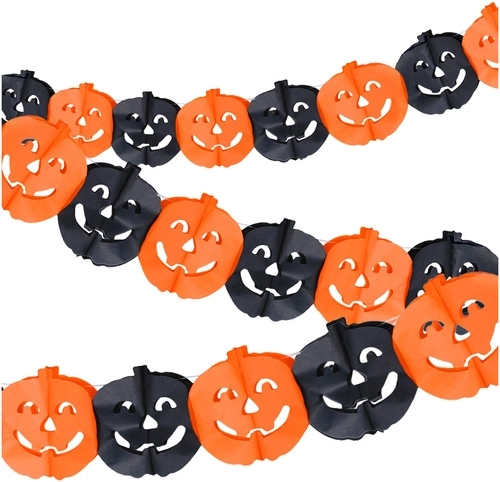 Papirnata girlanda s velikim bundevama u intenzivnoj narančastoj boji unijet će pravi halloween ugođaj na svaku zabavu. Duga je 3 m, a dimenzije jedne bundeve su 17,5 × 17,5 cm – upadljiva dekoracija za Halloween, jesenske proslave, za dom, vrtić, trgovinu ili vrt. Lagana konstrukcija i jednostavno vješanje omogućuju brzu dekoraciju s “WOW” efektom.