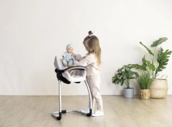 Ovaj multifunkcionalni set za lutke spaja tri omiljene funkcije u jednom: autosjedalicu za lako prenošenje, njihalicu kada se sjedalo objesi na konstrukciju te stabilnu visoku hranilicu nakon njenog okretanja. Idealan je za realističnu igru i razvoj dječje mašte.