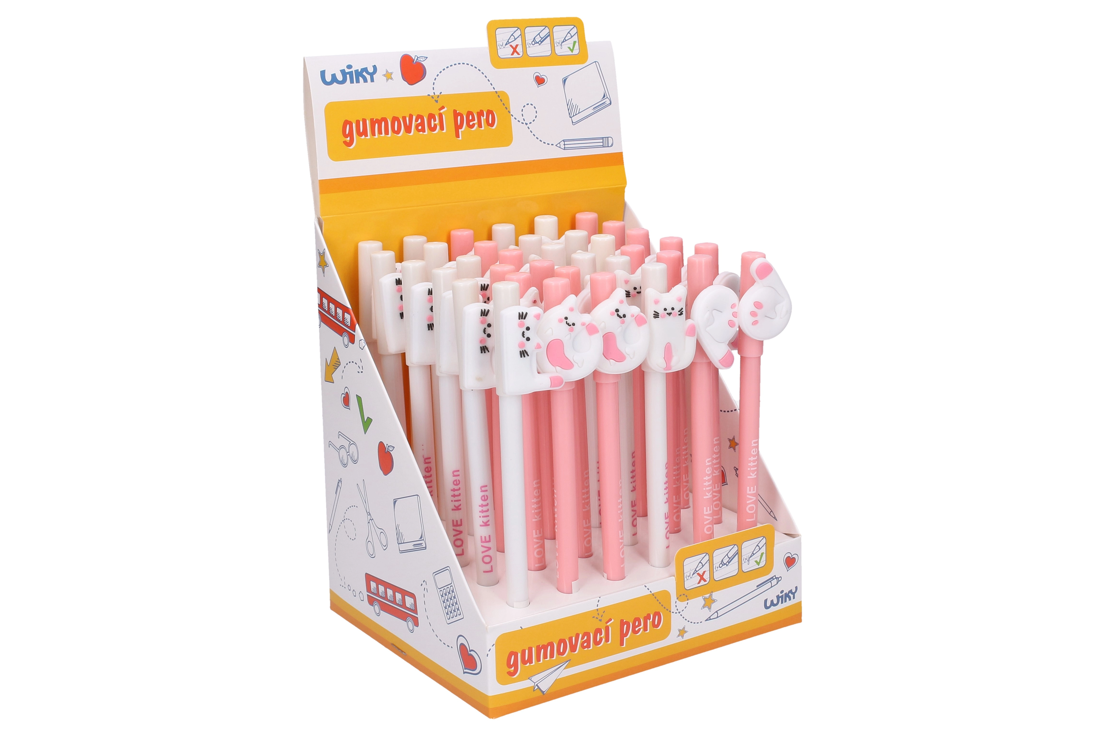 Preslatka olovka s gumicom s motivom mačića razveselit će i školarce i odrasle. Piše finom linijom od 0,5 mm, a zahvaljujući posebnoj tinti tekst se može lako izbrisati i ponovno napisati. Dostupna su 2 kolor izvedbe te praktično pakiranje od 36 komada u display boxu za pregledno izlaganje.