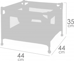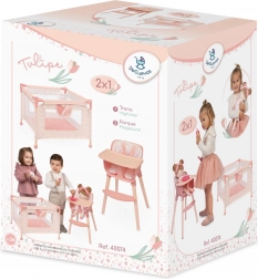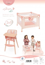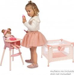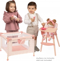 Set uključuje čvrstu igraonicu/ogranak s mrežastim bočnim stranicama i praktičnim džepom za sitnice te također visoku hranilicu s odvojivim pladnjem i trotočkastim pojasom za sigurno sjedenje lutke. Oba proizvoda su dizajnirana za lutke do 36 cm i ističu se lakom upotrebom i održavanjem.