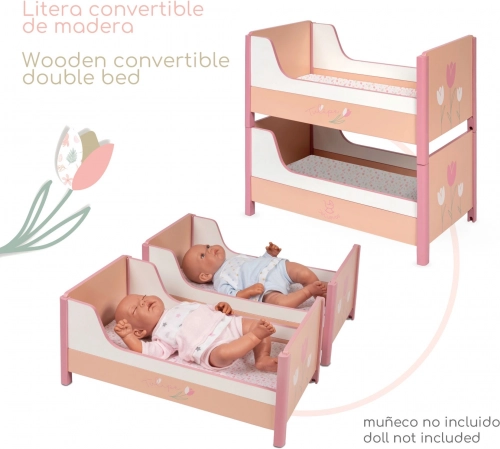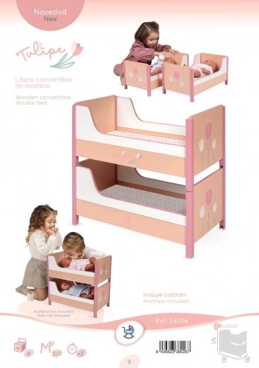 Pružite djeci prekrasnu scenu za njihove omiljene lutke. Drveni krevetić 2 u 1 iz kolekcije Tulipe u toplim losos nijansama sa stilskim cvjetnim uzorkom nudi i spavanje na kat, i razdvajanje u dva samostalna kreveta. Precizan španjolski dizajn i čvrsta konstrukcija od MDF-a i punog drveta jamče dug vijek trajanja i sigurnu igru.