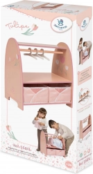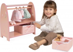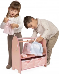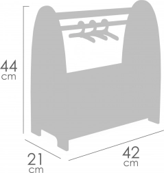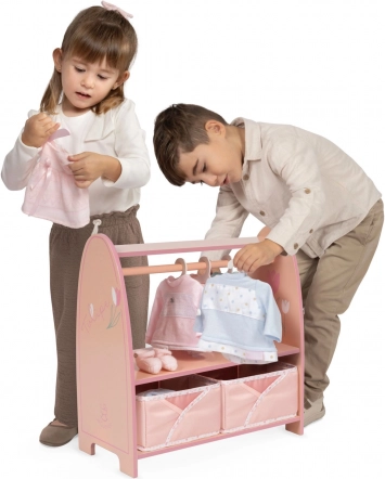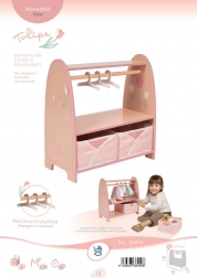 Priredite djeci red u svijetu lutaka. Ovaj kompaktni drveni garderobni stalak iz kolekcije TULIPE donosi praktično rješenje za vješanje i spremanje odjeće i dodataka. Garderobna šipka s 3 drvene vješalice prima odjeću do duljine cca 19 cm, donja polica i 2 sklopive platnene košarice čuvaju sve ostalo nadohvat ruke.