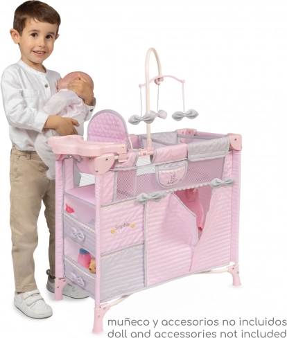 Otkrijte šarmantni krevetić za lutke iz kolekcije SOPHIE u nježnoj ružičastoj boji sa sivim i bijelim detaljima. Ovaj sklopivi model osmišljen je za udobnu igru, brzo sastavljanje i spremanje, a zahvaljujući promišljenom spremišnom prostoru pomaže održati red u dječjoj sobi.