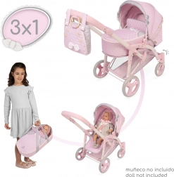 Funkcija 3-u-1 omogućuje mijenjanje podesive košare u sportsko sjedalo, dok prijenosna torba s pomičnim štitnikom štiti lutku od vjetra. Tročlani sigurnosni pojas osigurava sigurno pričvršćivanje, a okretni prednji kotači olakšavaju vožnju i skretanje. Podesiva ručka po visini (56/66/75/80 cm) raste s djetetom, a velika donja košara prima sve potrebne dodatke.