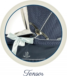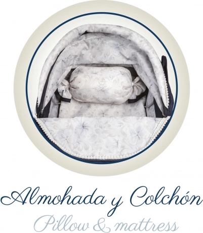 Sastavni dio je dekorativno prošivena torba koju je moguće pričvrstiti na kolica ili nositi preko ramena. Usklađeni dizajn u tamnoplavoj s bijelim detaljima.
