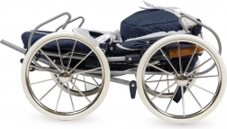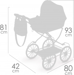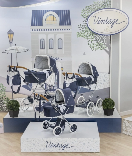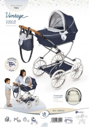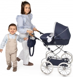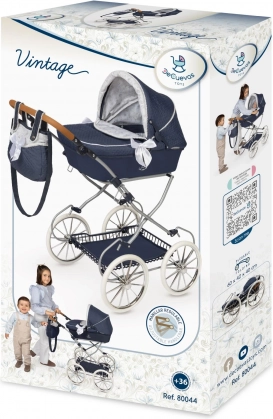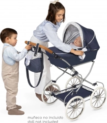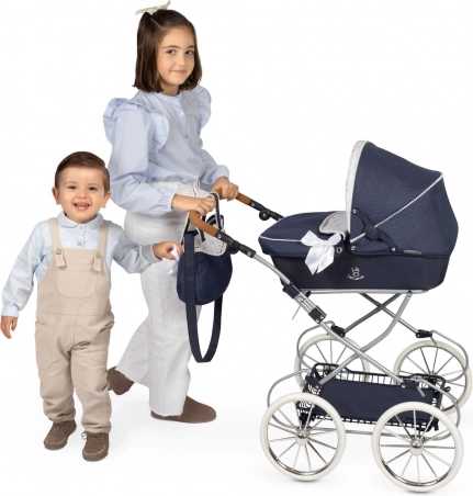 Otkrijte bezvremenski stil i udobnost s kolicima za lutke DE CUEVAS Vintage 2025. Kombinacija tamnoplave i ledeno bijele s nježnim tiskom, ukrasne mašne i kvalitetni materijali stvaraju luksuzan retro izgled nadahnut stvarnim dječjim kolicima. Zahvaljujući glatkom ljuljanju na oprugama i mekoj opremi svaka šetnja s lutkom bit će pravi užitak.