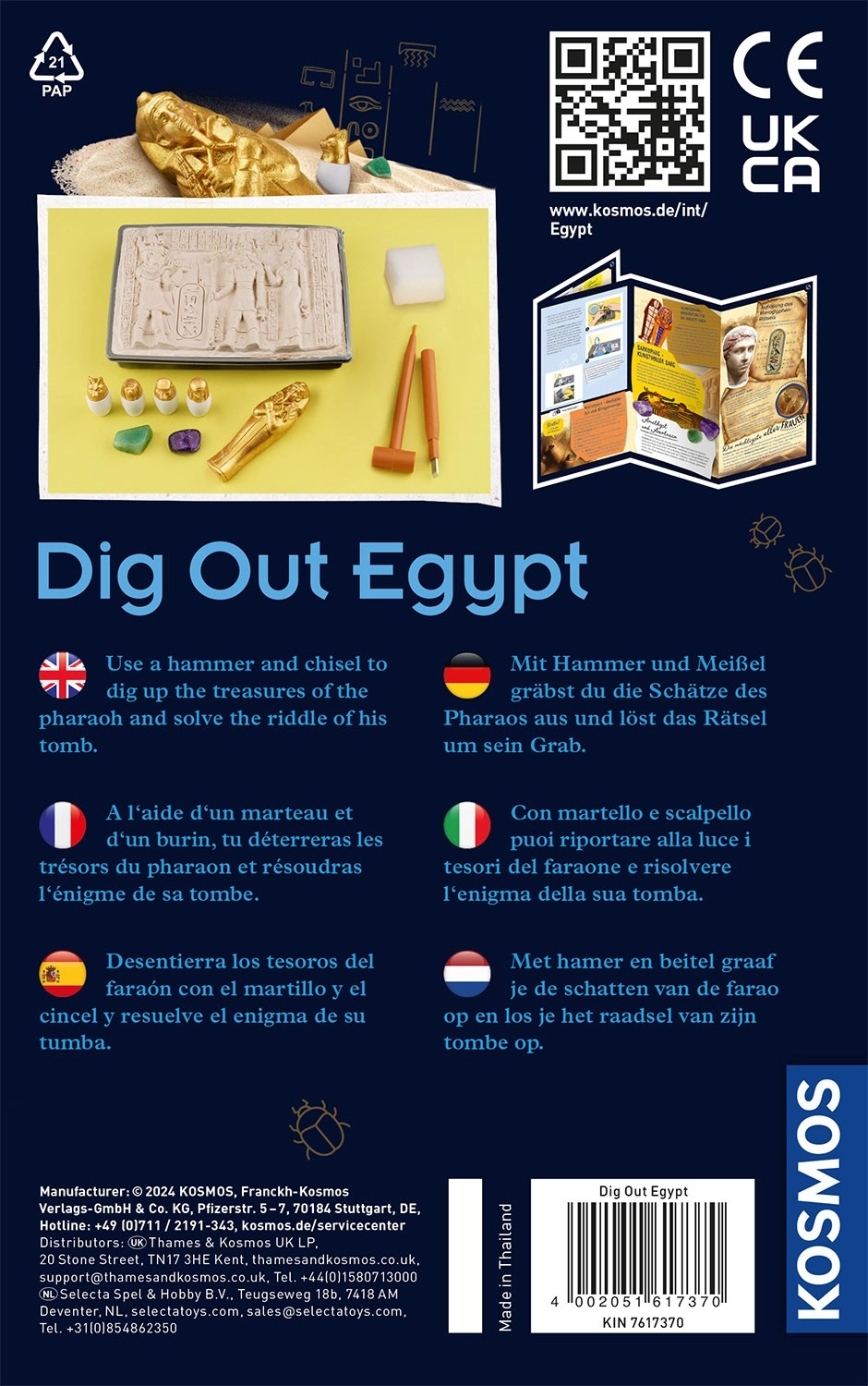 S arheološkim setom Kosmos egipatska iskapanja vaša će djeca postati mali arheolozi. Uz pomoć dlijeta i čekića korak po korak otkrivat će blago skriveno u gipsu i pritom naučiti mnogo zanimljivosti o starom Egiptu. Praktični slikovni priručnik dostupan je na engleskom jeziku s hrvatskim prijevodom, a hrvatske upute možete jednostavno preuzeti putem QR koda.