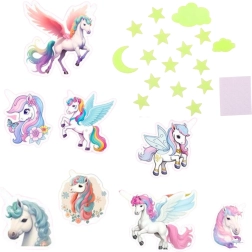 Stvorite čarobnu atmosferu u dječjoj sobi uz fluorescentne zidne naljepnice s motivom jednoroga. Pastelne likove nadopunjuju zvjezdice, mjesec i oblaci, koji nakon izlaganja svjetlu svijetle u mraku i stvaraju ugodnu atmosferu za uspavljivanje. Naljepnice se lako postavljaju zahvaljujući samoljepljivim pjenastim elementima, dobro prianjaju na zid, strop i namještaj te se mogu ukloniti bez tragova.