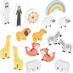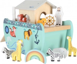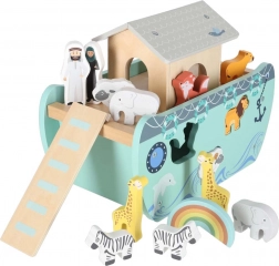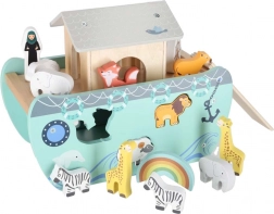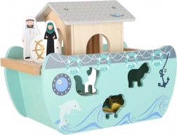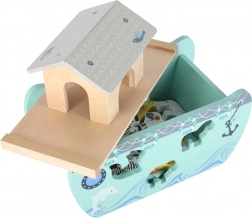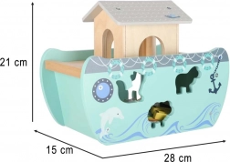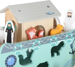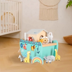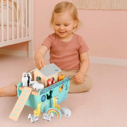 Otkrijte drvenu igračku koja spaja sortirnik oblika, slobodnu igru i pripovijedanje. Arka s odvojivom rampom i krovom skriva set životinjskih figurica i dvije figure Noe sa suprugom – djeca mogu ukrcavati brod, upravljati kormilom i umetati životinje u odgovarajuće otvore.