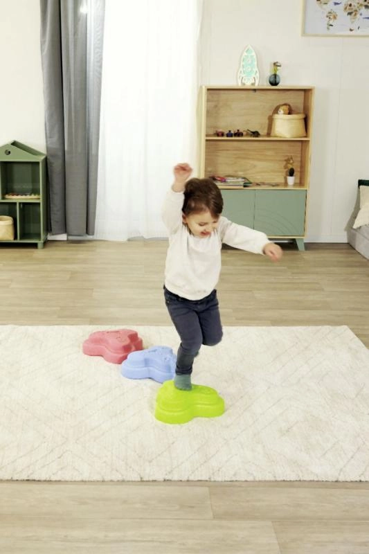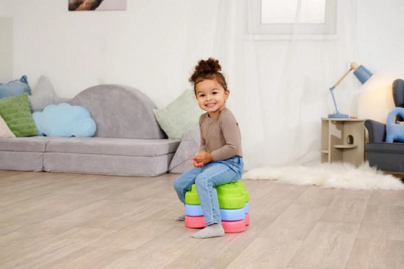 Set HEPPY balansnih kamenčića pretvara svaku sobu u zabavnu senzornu stazu. Pet komada u živim bojama (crvena, plava, zelena, narančasta, žuta) motivira djecu na skakanje, preskakanje i slaganje, čime prirodno jačaju stabilnost, koordinaciju i sigurnost pokreta.