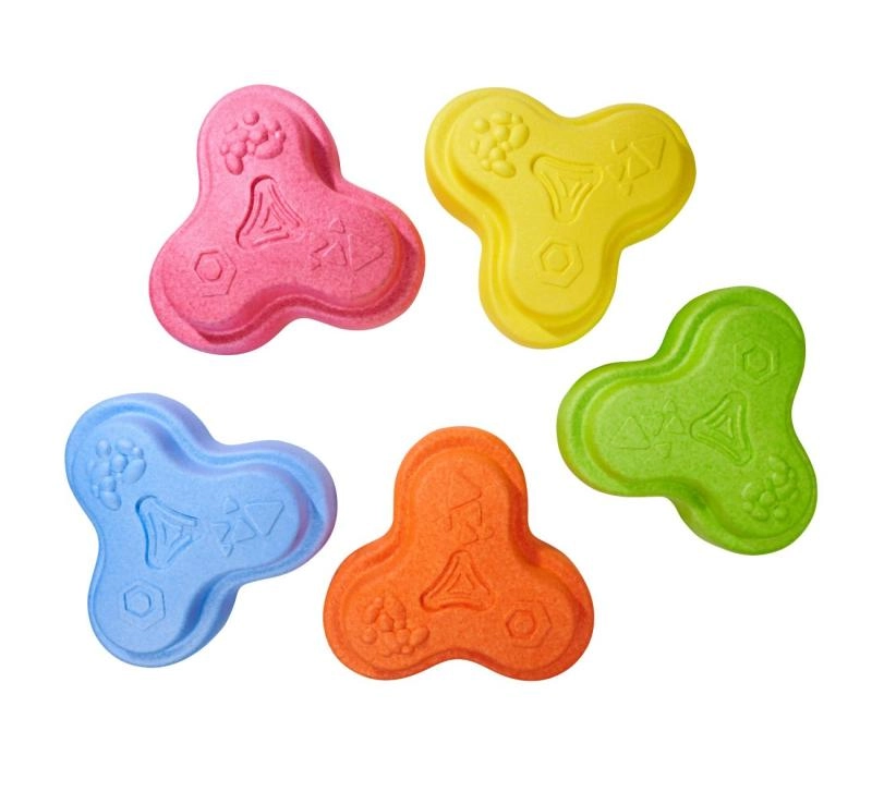 Izrađeni od EPP-a (ekspandirani polipropilen), kamenčići su iznimno lagani, ujedno izdržljivi i ugodno topli na dodir u usporedbi s uobičajenim plastičnim igračkama. Lako se čiste, otporni su na slinu i znoj te izvrsno funkcioniraju u kući i na otvorenom.