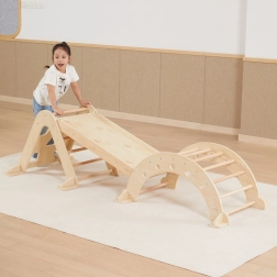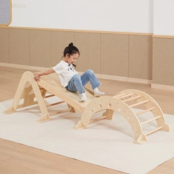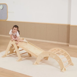 Ploča je kompatibilna s dodacima (ljuljačka/rocker i penjački trokut), zahvaljujući čemu se može stvoriti modularni set za kućno vježbanje i aktivnu igru. Prikladno od 18 mjeseci, razvija samostalnost, sigurnost u kretanju i radost prirodne aktivnosti inspirirane Montessori principima.